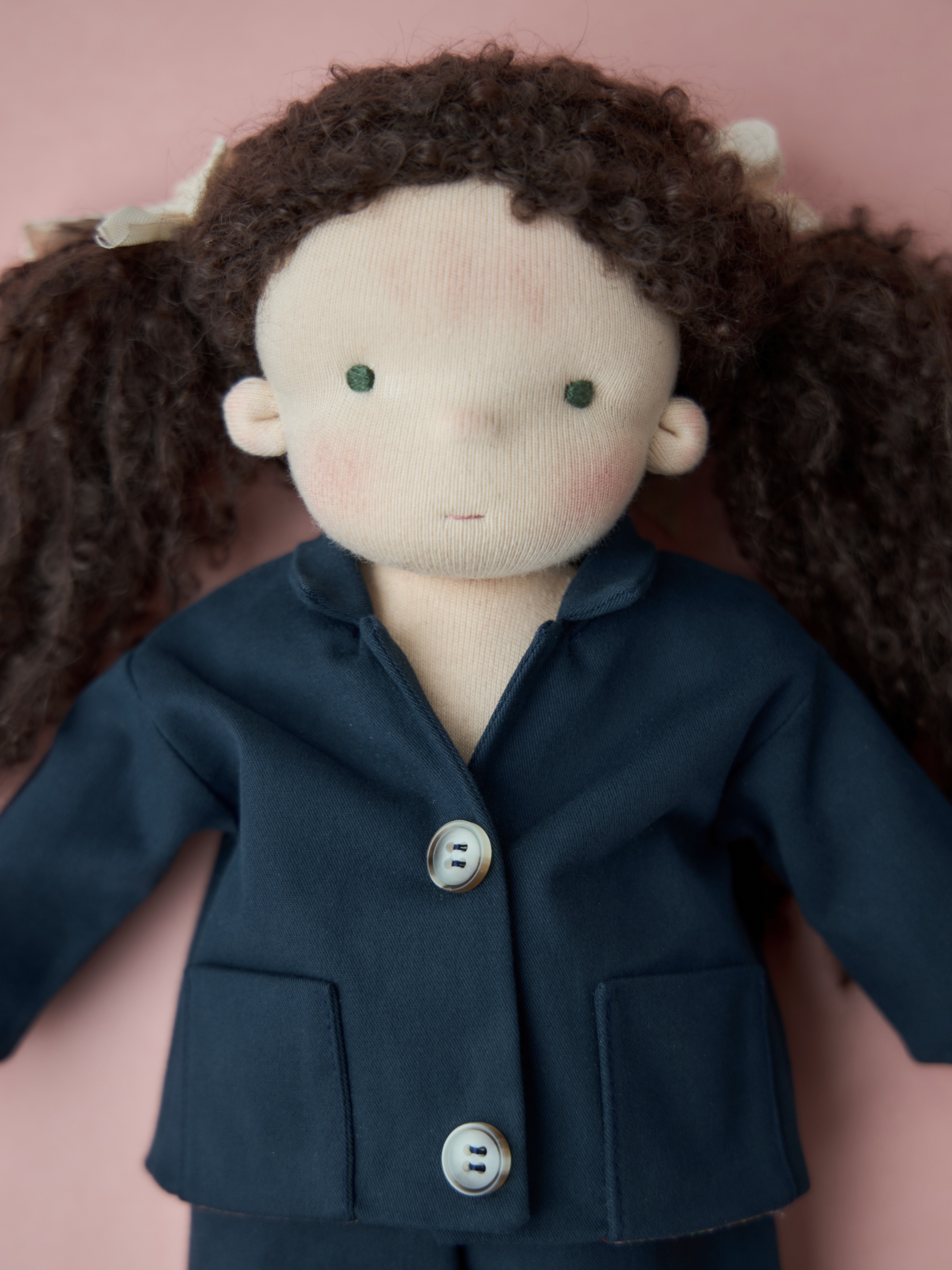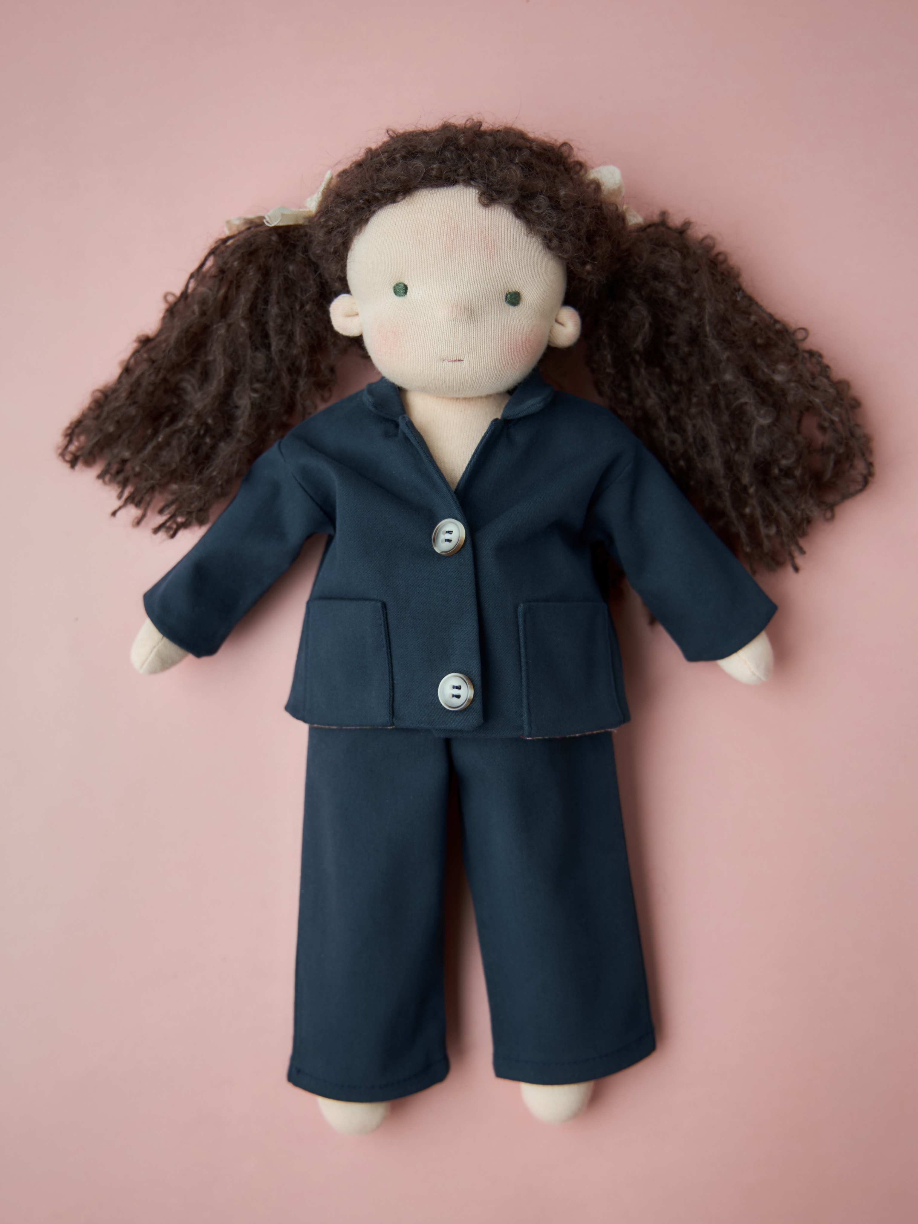 Костюм Workwear — теперь в миниатюре для вашей куклы Azi. Изготовленный из 100% органического хлопка, он повторяет крой нашей взрослой линии. Свободный фасон пиджака и брюк позволяет легко переодевать куклу, создавая разные образы. Накладные карманы и классические пуговицы завершают этот практичный и стильный комплект. Незаменимый базовый элемент для гардероба маленькой спутницы.