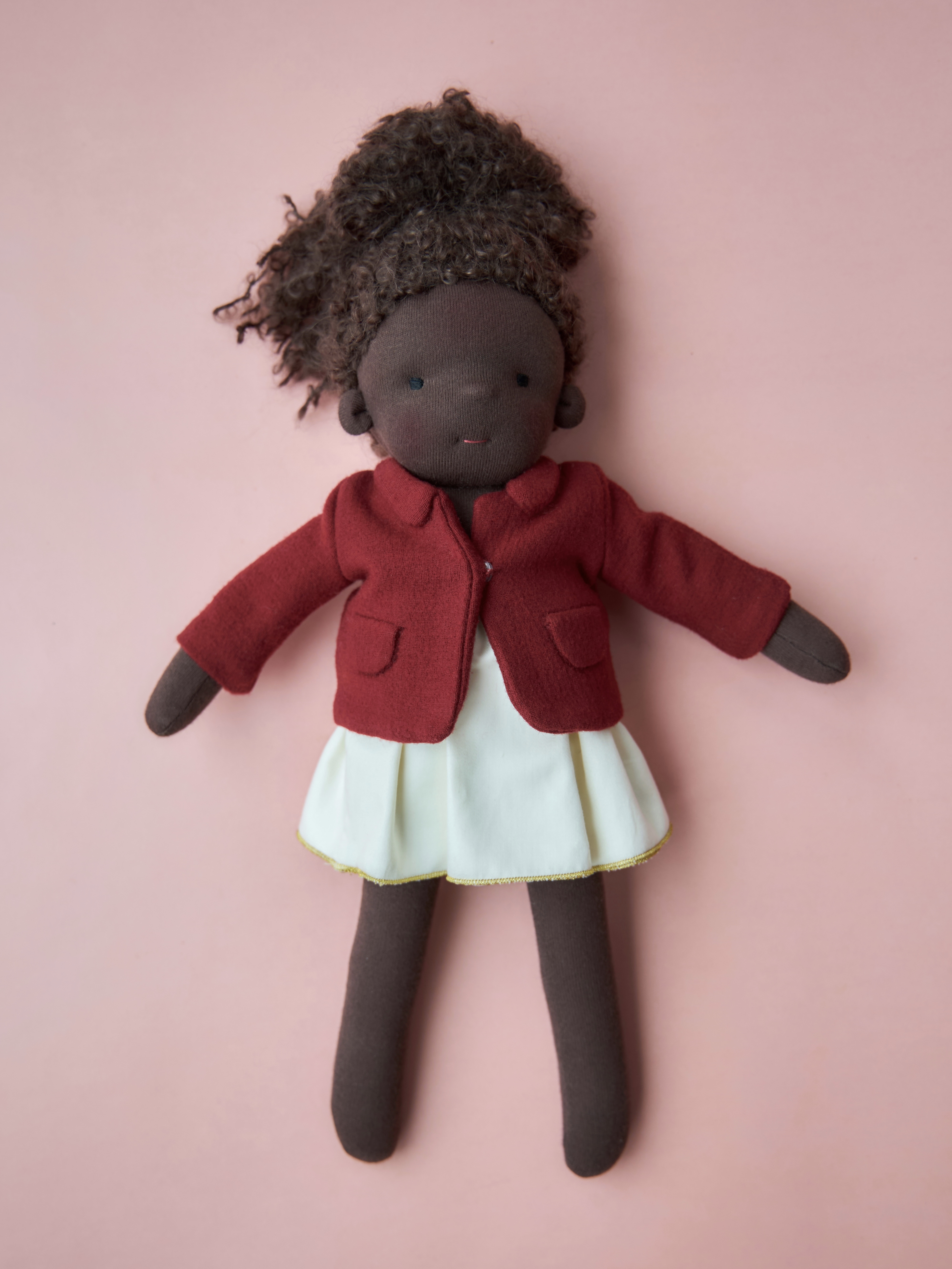 Наряд  Esha&Sari — это гармоничный ансамбль, объединяющий наш знаковый жакет и изящную юбку в единый образ для куклы Azi. Укороченный жакет ярко-красного цвета сохраняет элегантный крой и верность традициям бренда, придавая маленькой спутнице выразительность и утонченность. Его идеально дополняет юбка Sari (что на санскрите означает «водопад») — модель с высокой талией из фактурного хлопка, чей А-силуэт украшен золотистой каймой. Этот комплект привносит дух истинного мастерства и культурного наследия в мир игры, оставаясь стильным и универсальным решением для любого гардероба.