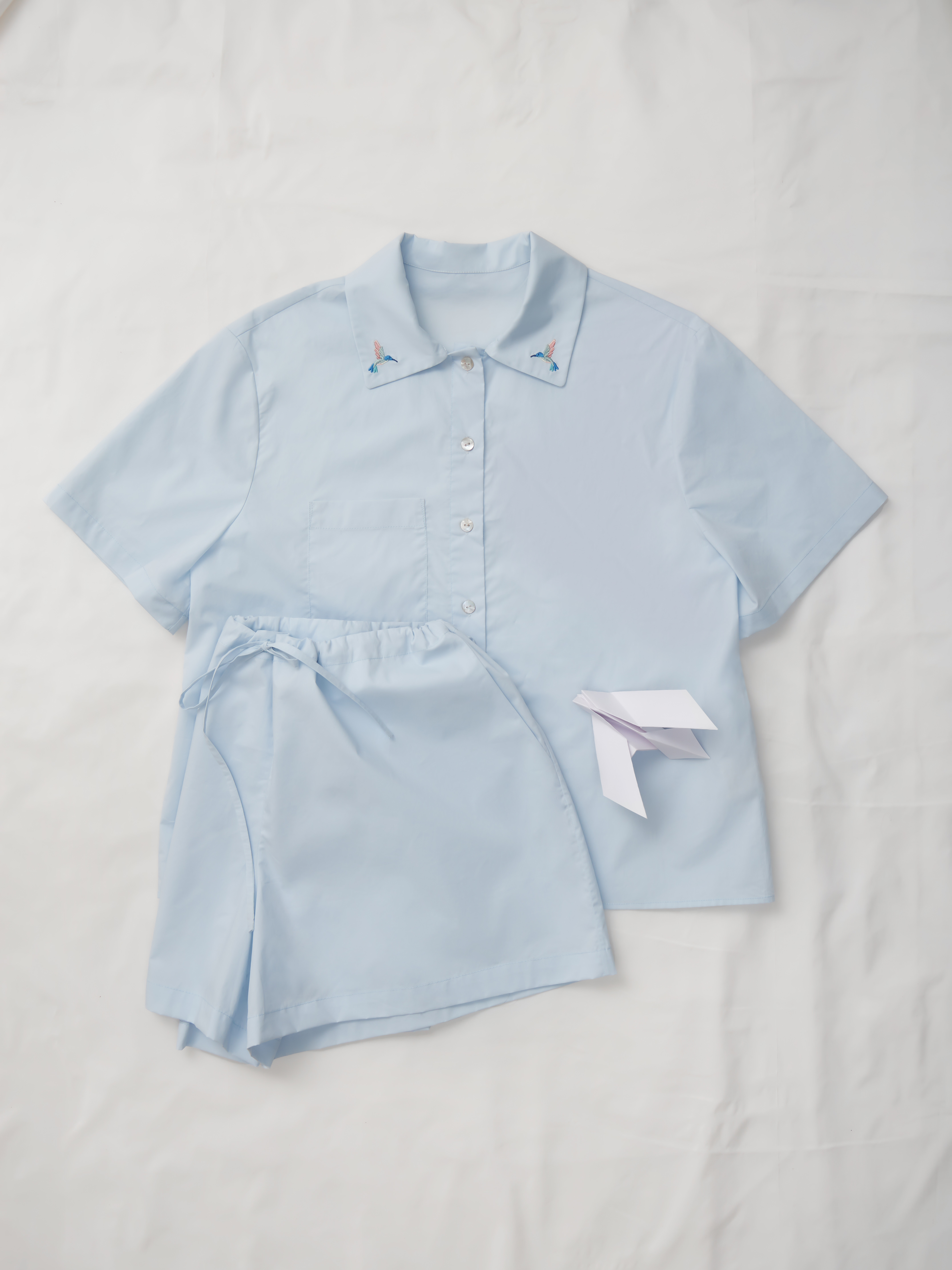 Sama Pj — это пижамный комплект, представленный в голубом и жёлтом цветах, вдохновлённых спокойствием и чистотой неба. В комплект входят рубашка с коротким рукавом и аккуратным нагрудным карманом, а также свободные шорты с регулируемой завязкой на поясе. Модель выполнена из 100% хлопка — лёгкого, дышащего и приятного к телу. Изящная вышивка с колибри на обоих воротниках добавляет образу тонкий поэтичный акцент. Название Sama, что в переводе с арабского означает «небо», отражается в воздушном характере комплекта и его расслабленном силуэте.